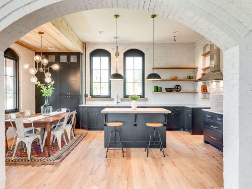 This radiant limewashed brick house blends cedar shake dormers, timber framing and limewashed brick on the exterior, creating a chic traditional feel. The interior features a limewashed arch, bunkroom, and natural stone sills.